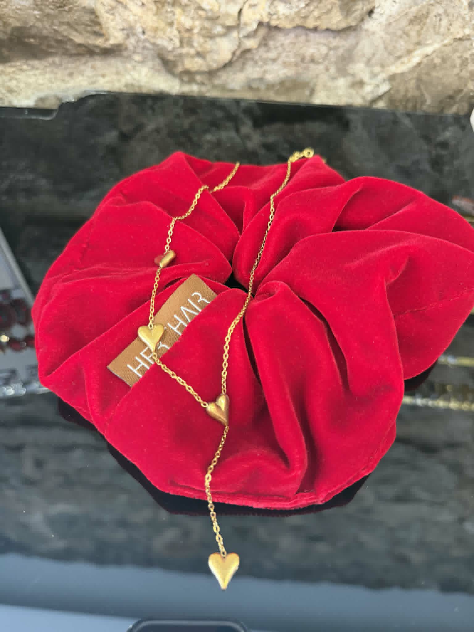 Χειροποίητο scrunchie από σατέν ύφασμα σε εντυπωσιακό κόκκινο χρώμα, διακοσμημένο με λεπτή αλυσίδα και χρυσές καρδούλες. Ρομαντικό και κομψό αξεσουάρ που δίνει λάμψη σε κάθε χτένισμα – από casual εμφανίσεις μέχρι πιο ιδιαίτερες περιστάσεις.