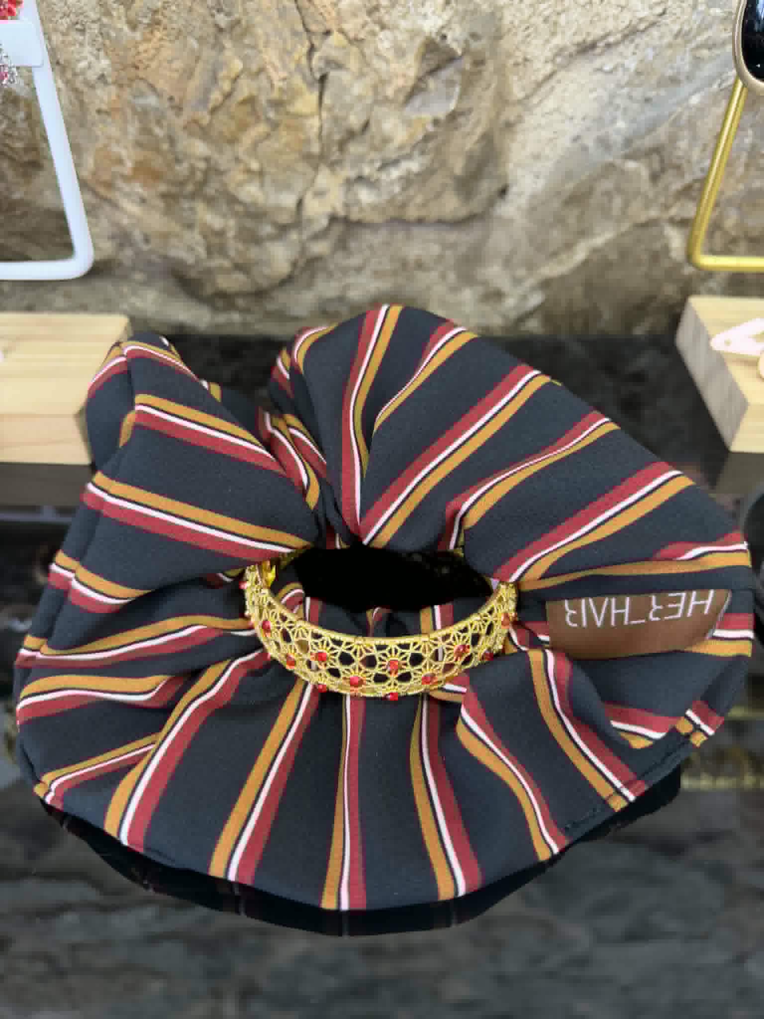 Κάθε scrunchie δημιουργείται στο χέρι, με προσοχή στη λεπτομέρεια και αγάπη για το ξεχωριστό στυλ. Το σατέν ύφασμα με διαχρονικές ρίγες αγκαλιάζει απαλά τα μαλλιά χωρίς να τα ταλαιπωρεί, ενώ η χρυσή διακοσμητική λεπτομέρεια με κόκκινες πέτρες προσθέτει έναν αέρα πολυτέλειας. Ιδανικό για να αναβαθμίσεις ένα απλό καθημερινό look ή να ολοκληρώσεις μια πιο ιδιαίτερη εμφάνιση. Άνετο, σταθερό και εντυπωσιακό — ένα αξεσουάρ που τραβά τα βλέμματα. Γιατί θα το αγαπήσεις: 100% χειροποίητη κατασκευή Απαλό σατέν που προστατεύει τα μαλλιά Ελαστική εφαρμογή χωρίς να σπάει την τρίχα Statement λεπτομέρεια που κάνει τη διαφορά Ένα μοναδικό κομμάτι για μοναδικές εμφανίσεις
