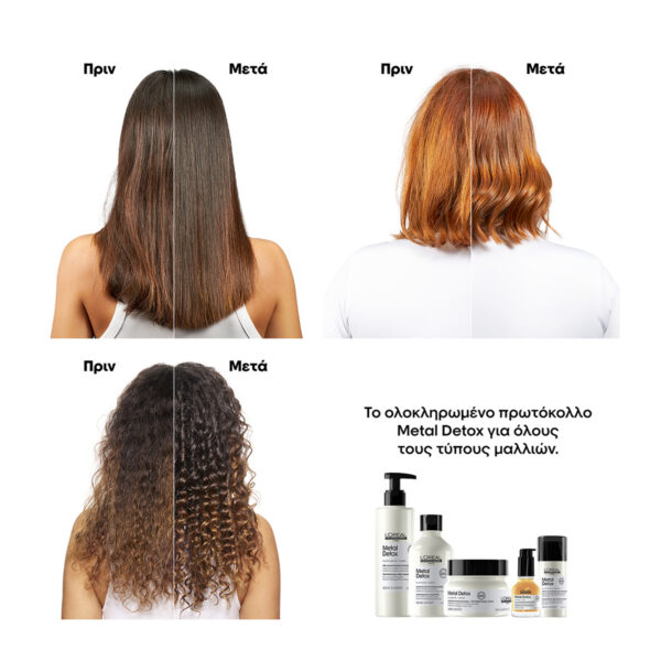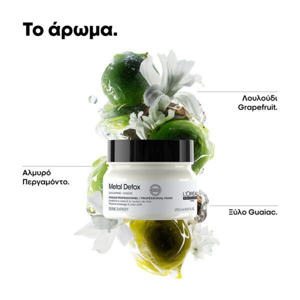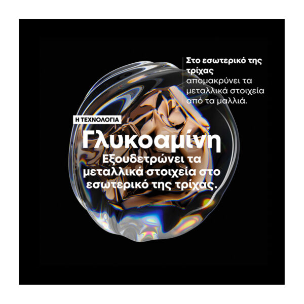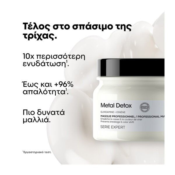 Επαγγελματική σύνθεση για την προστασία από τα μεταλλικά στοιχεία. Εμπλουτισμένη με Γλυκοαμίνη, η Serie Expert Metal Detox Μάσκα απομακρύνει τα μεταλλικά στοιχεία στο εσωτερικό της τρίχας και αποτοξινώνει τα μαλλιά, προσφέροντας τους ελαστικότητα, ανθεκτικότητα, έως και 87% λιγότερο σπάσιμο, 100% αξιόπιστο αποτέλεσμα χρώματος και λάμψη.Για βέλτιστα αποτελέσματα, χρησιμοποιήστε μετά από το Metal Detox Σαμπουάν. Συνεχίστε με το υπόλοιπο πρωτόκολλο του Metal Detox.