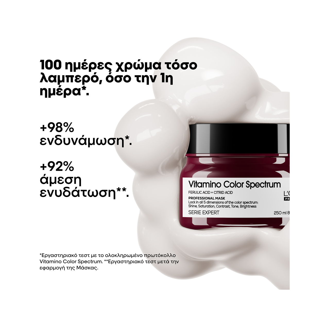 Vitamino Color Spectrum Επαγγελματική Μάσκα από τη L’Oréal Professionnel, εμπλουτισμένη με Φερουλικό Οξύ + Κιτρικό Οξύ. 100 ημέρες χρώμα τόσο λαμπερό, όσο την 1η ημέρα*.